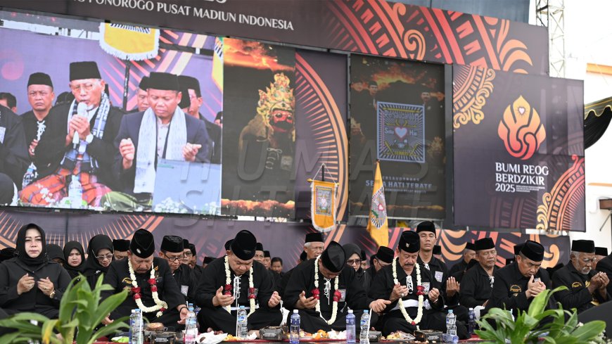 Puluhan Ribu warga Persaudaraan Setia Hati Terate mengikuti Bumi Reog Berdzikir 2025 di Ponorogo, mendoakan persatuan dan korban bencana Sumatra.